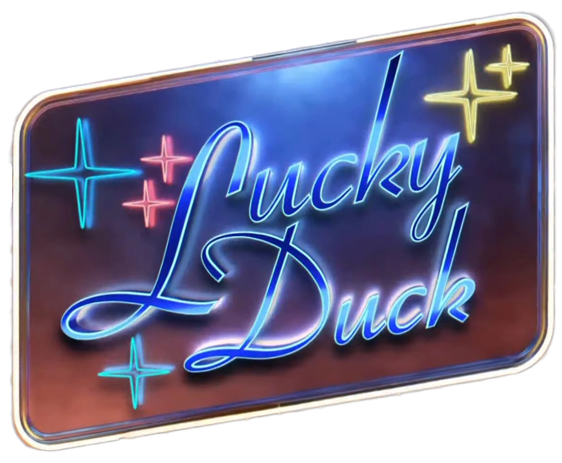 Lucky Duck is a white pekin duck wearing a golden mask, a brown boater hat with golden feathers on the right side being held by a blue ribbon with brown stripes. He is also wearing a light yellow waistcoat with brown buttons, alongside a gold trench coat. He has a round feathered body with visible orange legs and duck feet.