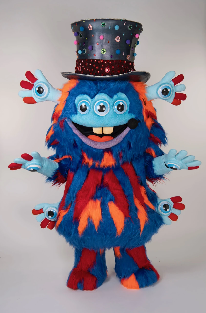 Monsqueeze is a monster. They have a light blue face with three goofy looking eyes, and a smiling mouth with 2 buck teeth. They have blue, orange and red fur across his entire body and legs. They have six arms which are light blue with some red on various fingers, with an eye on each palm of his hands. They wear a black and red top hat with sequin jewels of various colors adorning it, resembling eyes.