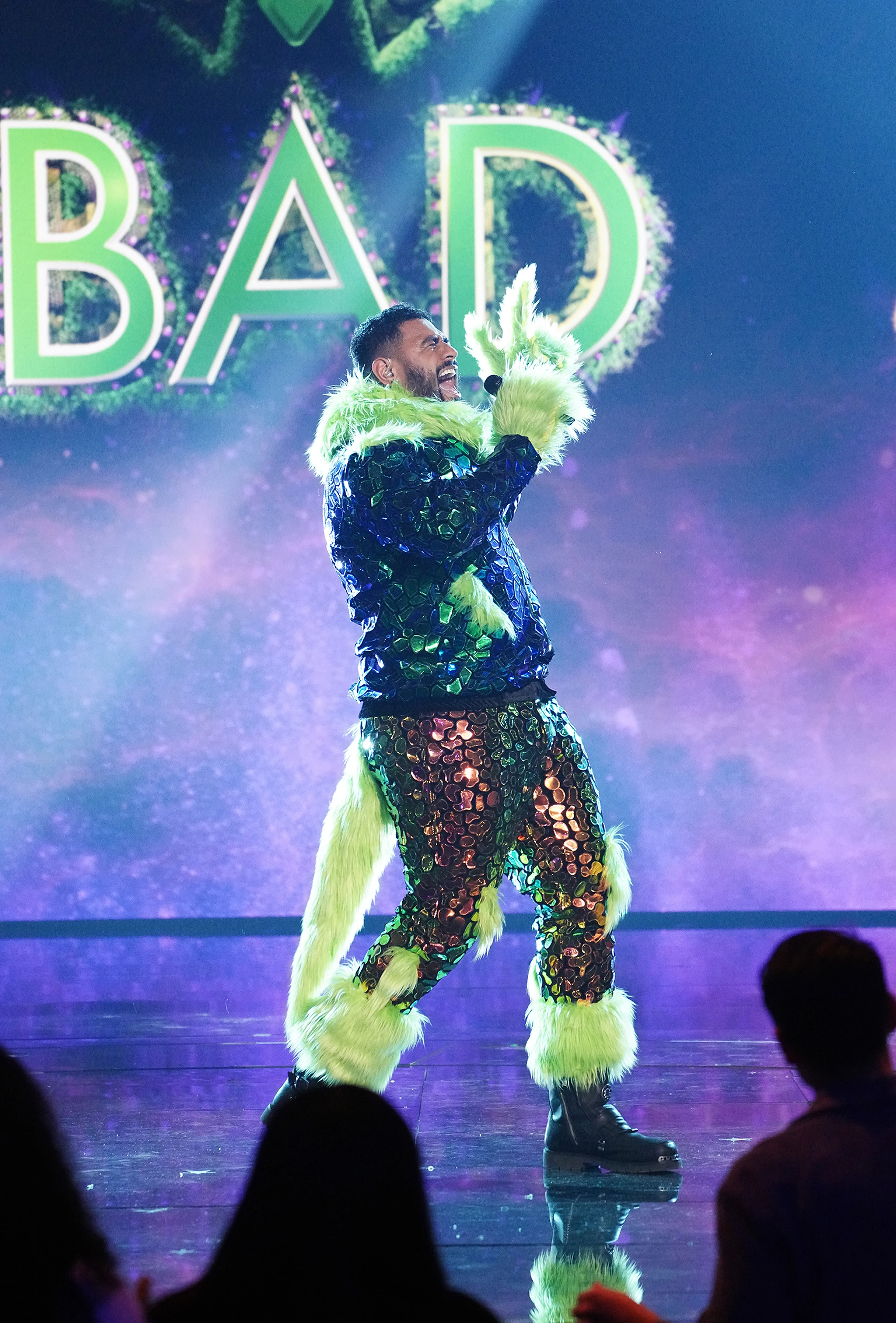 Thingamabob has lime green fur and wears a blue vest and orange pants, each covered in sequins. His mask has an almost Piranha-like appearance, with two large ears.