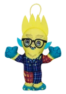 The costume features a two-tone checkered suit with neon yellow trim. The suit is predominantly dark blue, however the right leg and left arm, are made from a yellow tartan fabric. The feet and hands of Thingamajig, are covered in teal coloured fur and claws. The mask itself resembles that of a monster, covered in neon yellow fur with teal accented facial features and brown glasses.
